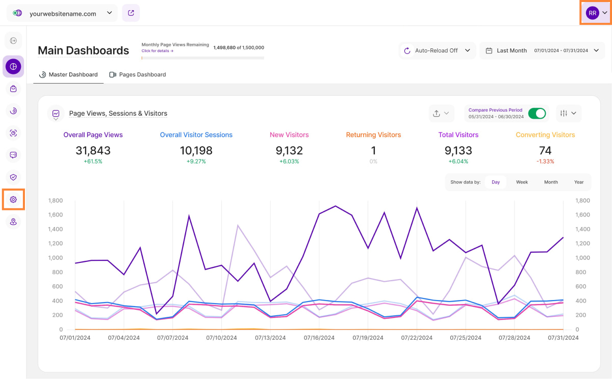 • Website Settings: This area allows you to view and edit settings for each website within your account. You can configure specific details and preferences for individual websites, making sure that each website's settings align with your needs. Access the Website Settings by clicking the gear icon on the main navigation bar on the left.