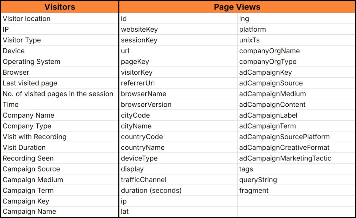 The contents of the export file vary depending on the export type you choose. In addition to visitor details, such as location, IP address, device type, and browser, the export also includes key data related to UTM campaigns. This allows you to track traffic sources, marketing channels, and campaign performance more effectively, making it easier to understand how different campaigns drive visitor activity and engagement.