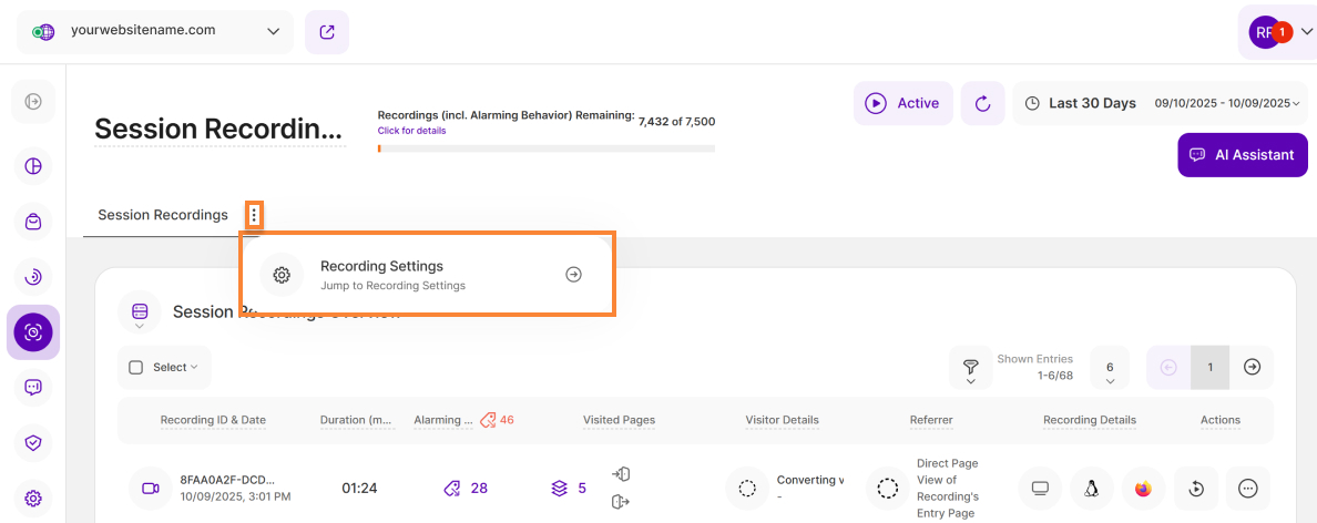 • To control the recording of new visitor sessions, simply toggle the 'Active' button in the upper right corner of this view (situated adjacent to the reload icon). This allows you to pause or reactivate recording at any time.