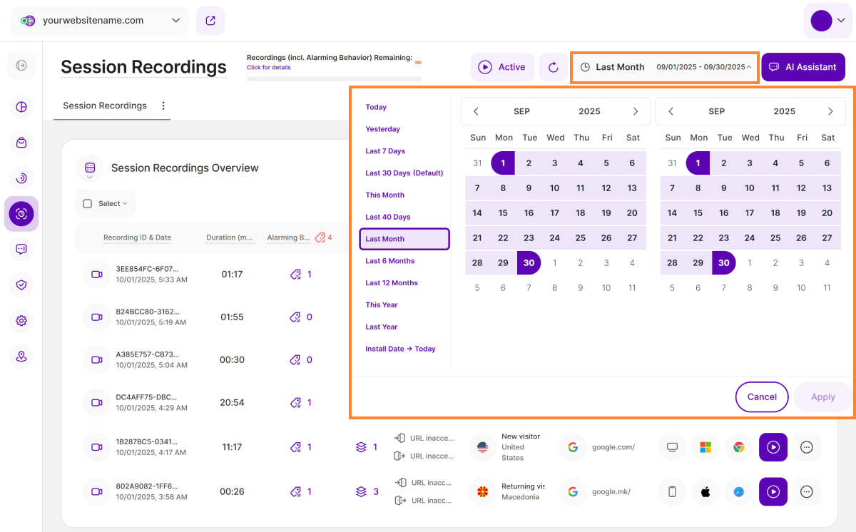 1. Recording ID & Date: This column shows the session recording's unique ID, which is generated automatically by the platform. You can use these IDs to search in the report block's filters. The date and time indicate when the respective session recording was created.