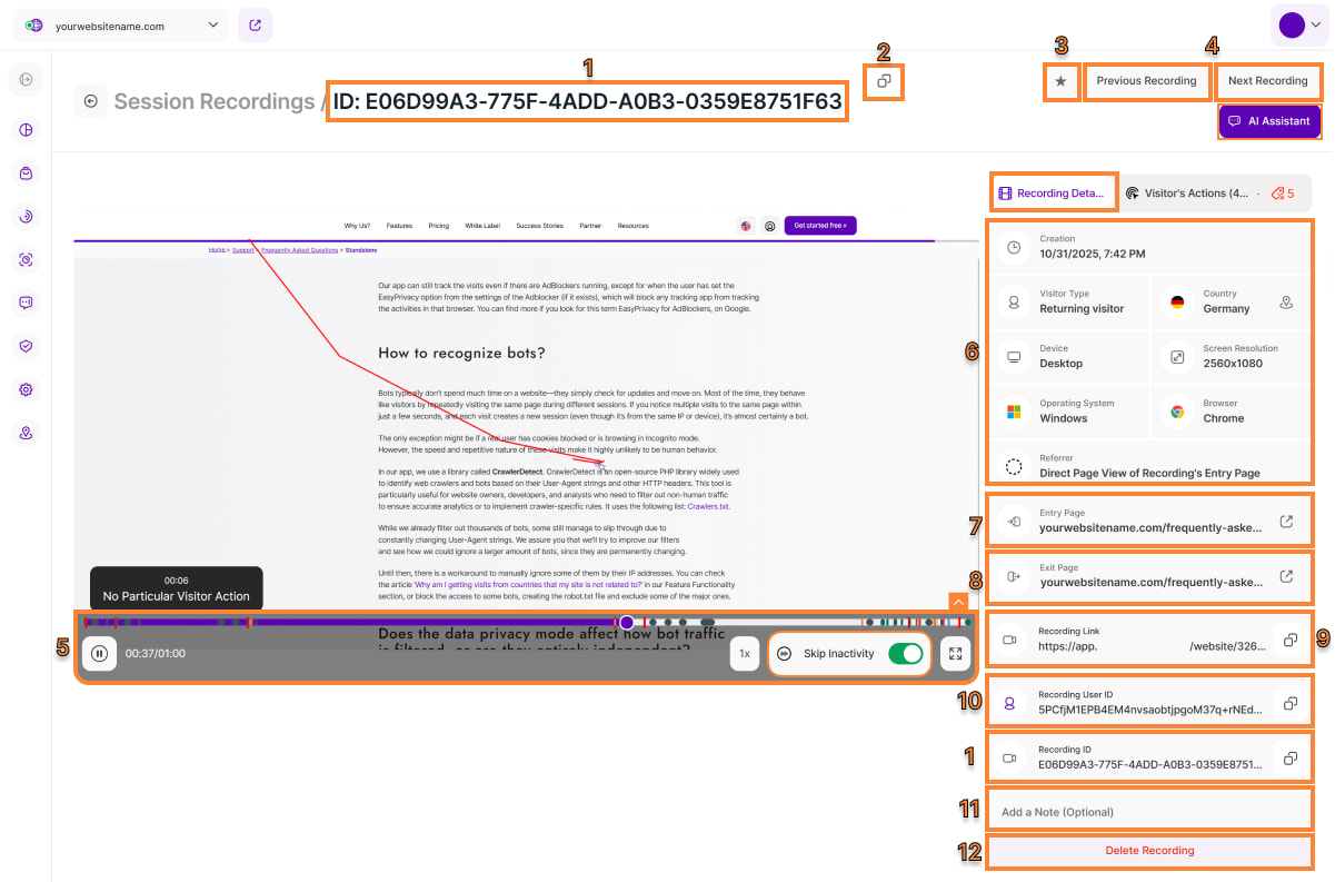 10. Recording User ID: This is another unique identifier but this one is unique to the visitor rather than the recording. You can easily copy it using the Copy to Clipboard icon next to it.