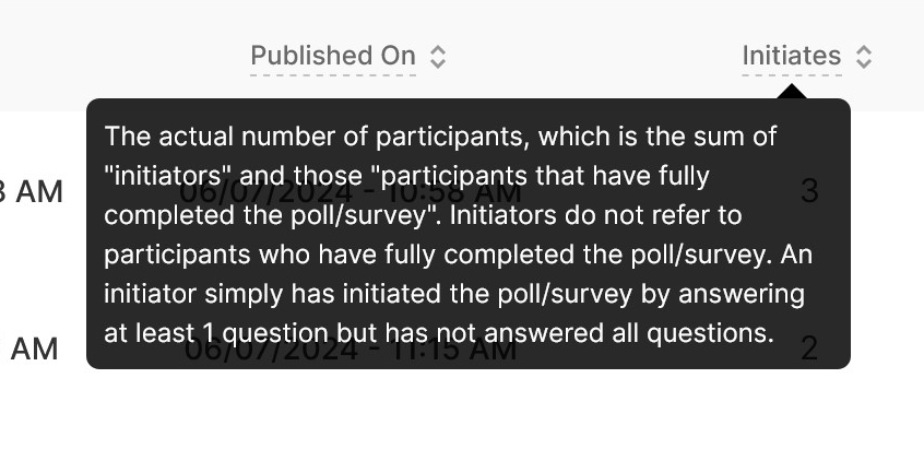 5. Initiates: The actual number of participants, which is the sum of "initiators" and those "participants that have fully completed the poll/survey". Initiators do not refer to participants who have fully completed the poll/survey. An initiator simply has initiated the poll/survey by answering at least 1 question but has not answered all questions.