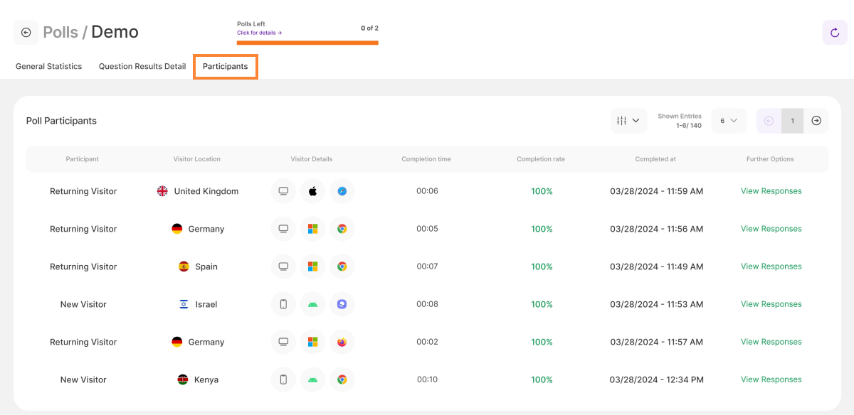 7. Completion Rate: The ratio of participants that finished all questions of a poll/survey in comparison to the amount of people that replied to at least one question. Hint: You can also check each participant's completion rate individually within the participants table.
