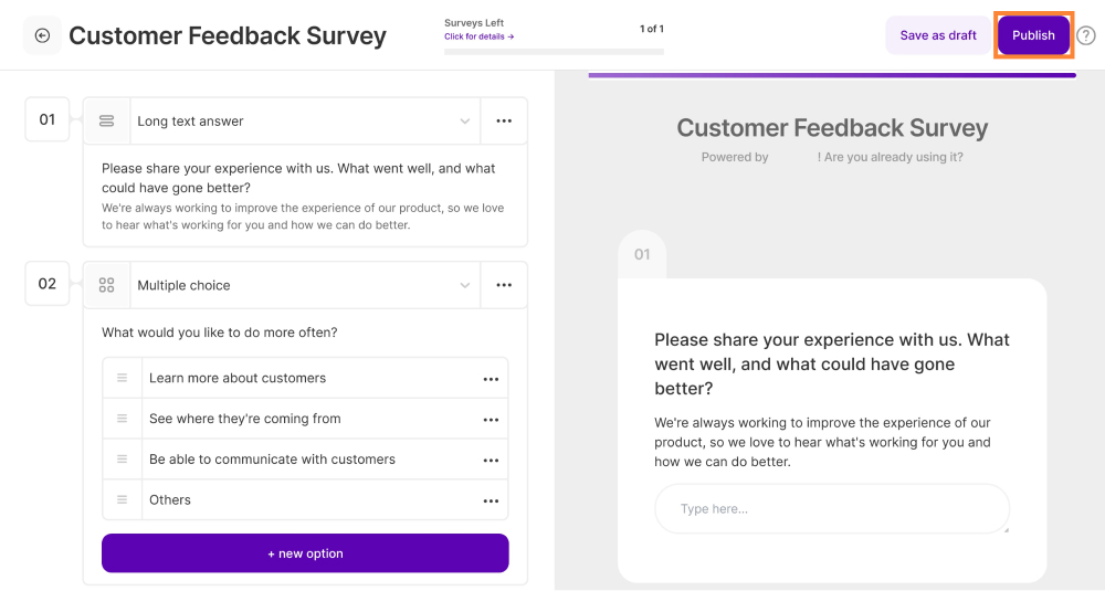 Both polls and surveys can be easily published or activated. After you finished adding all the questions, selecting potential targeting options, and customizing the appearance, you can click on the "Publish" button in the upper right corner.