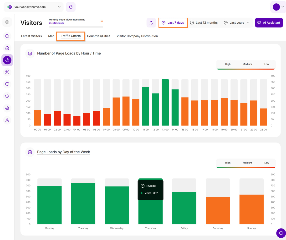 1. Number of Page Loads by Hour / Time: This graph presents the distribution of page loads on an hourly scale, based on the selected time range. It allows you to understand at what times of the day your website experiences the highest and lowest page loads. This supports the data shown in the "Number of Visitors by Hour / Time" graph.