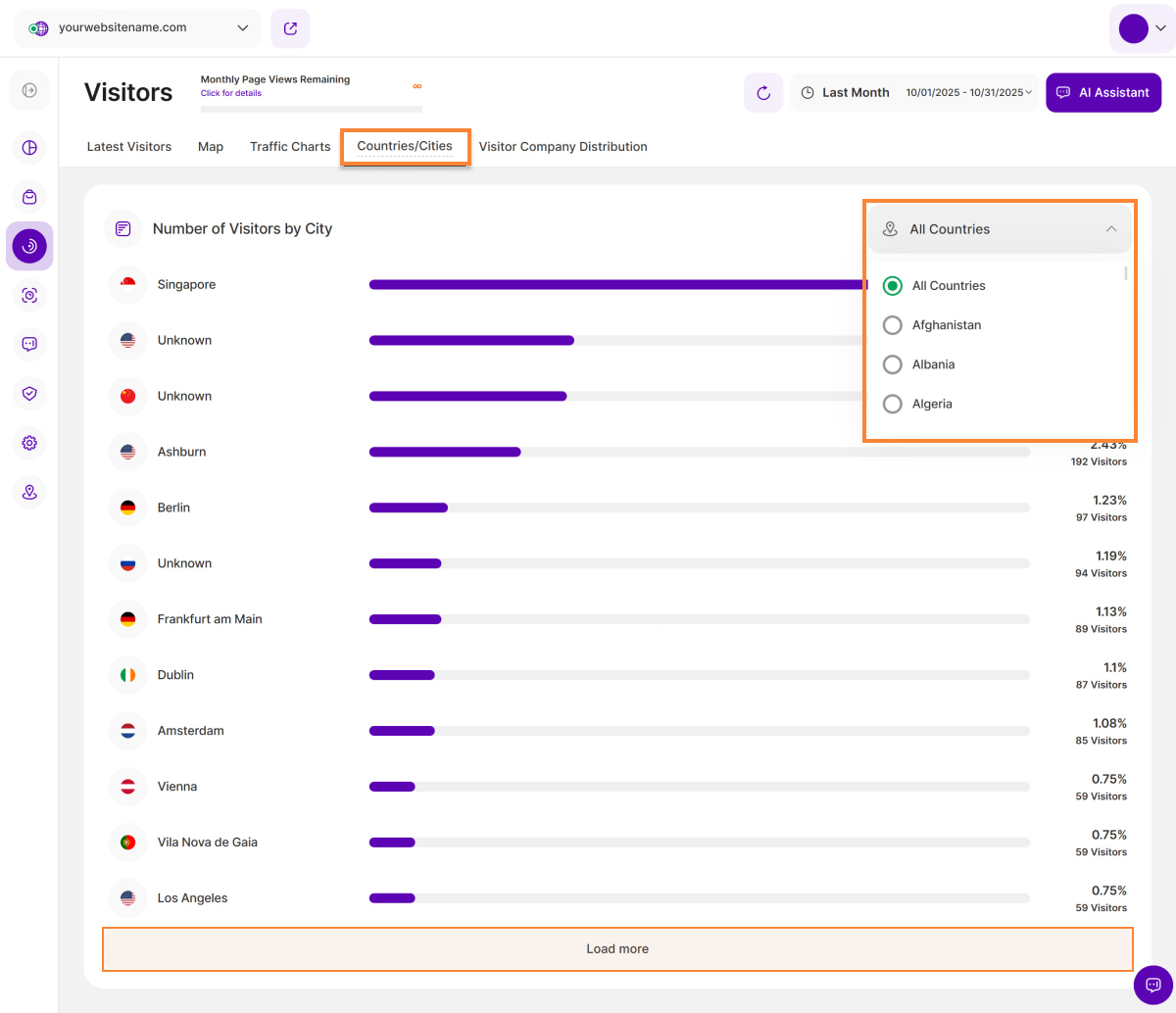 The Countries/Cities tab acts as an extension of the map view. It is composed of two report blocks that display all the countries and cities that generate visitors or traffic for your website. Countries and cities generating the highest number of visitors are listed first.
