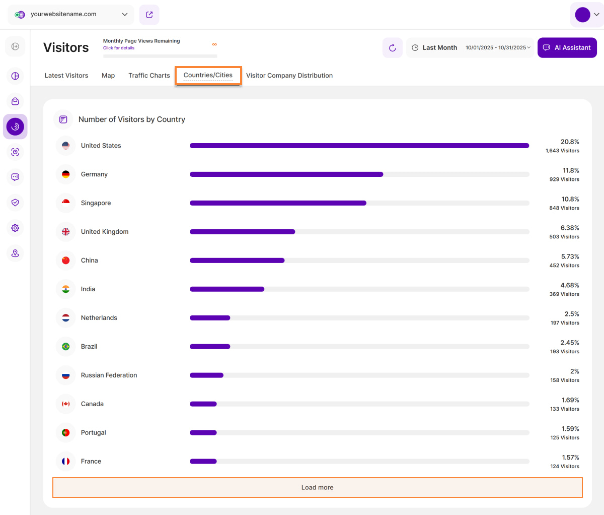 • Percentage: The percentage shown next to each bar indicates the proportion of total visitors attributed to that particular country, helping you gauge the relative contribution of each country to your overall web traffic.