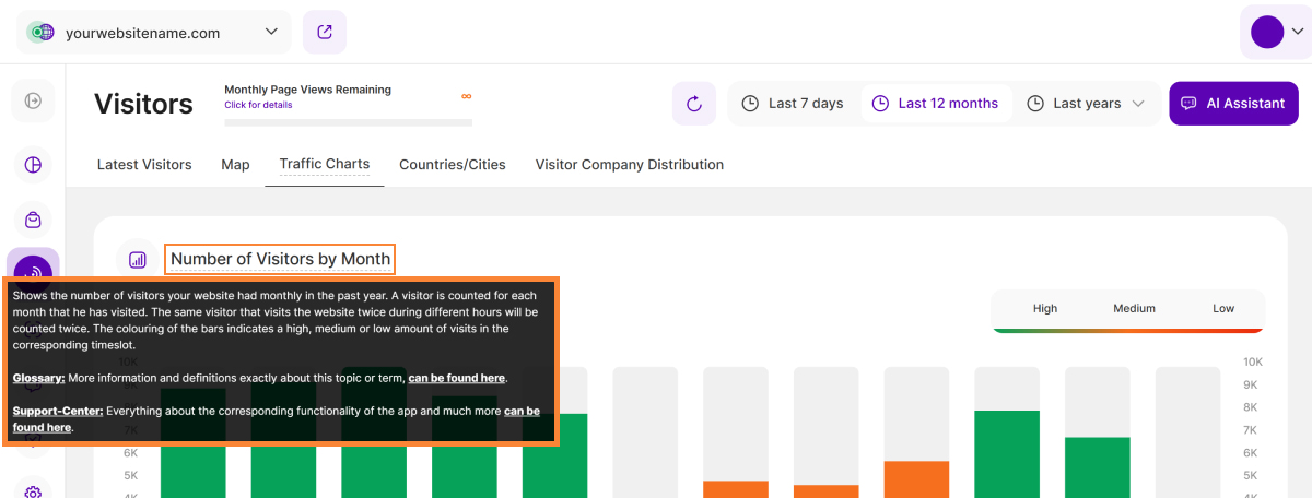 1. Number of Visitors by Month: Shows the number of visitors your website had monthly in the selected year. A visitor is counted for each month that he has visited. The same visitor that visits the website twice during different hours will be counted twice. The colouring of the bars indicates a high, medium or low amount of visits in the corresponding timeslot.