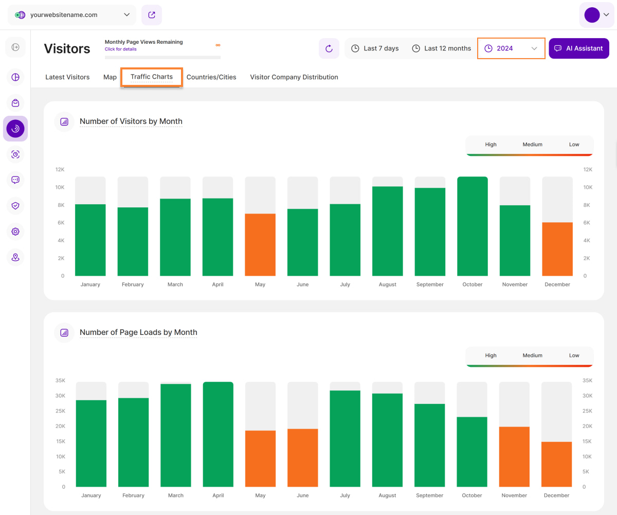 2. Number of Page Loads by Month: Shows the number of page views your website had monthly in the selected year. This supports the data of the graph "Number of Visitors by Month".